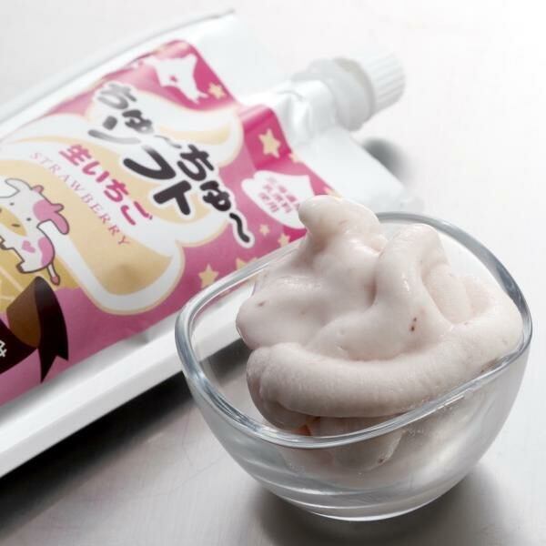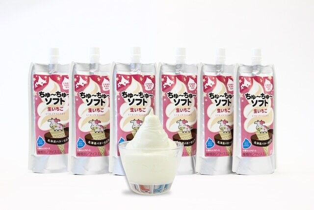 十勝の生乳、バター、スキムミルク、果糖、昆布酸(安定剤)など、すべて天然素材を使用して います。十勝鹿追産の生イチゴを使用しており、程よい酸味と甘さと、つぶつぶ食感も味わえます。