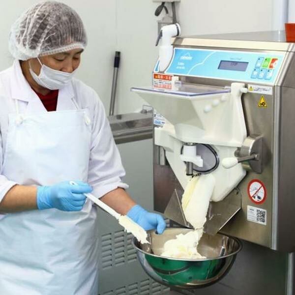 フリーザーという機械から出てきた出来立てのソフトクリームを、専用の充填機で一本一本丁寧に詰めています。
